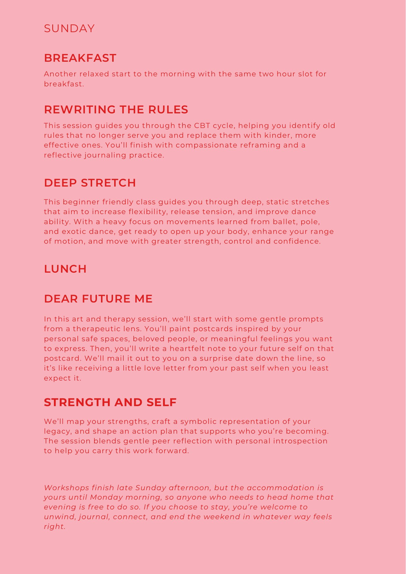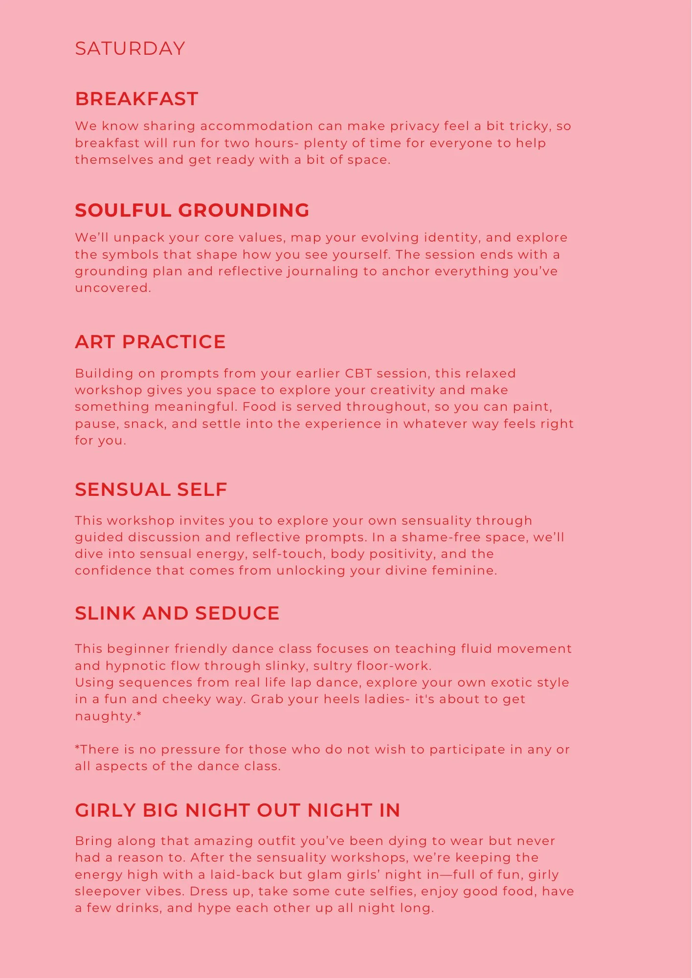 For those who want to stay, you're welcome to enjoy the space a little longer: relax, unwind, soak up everything you've learned, journal, connect with the other women, and finish the weekend in a way that feels right for you.
