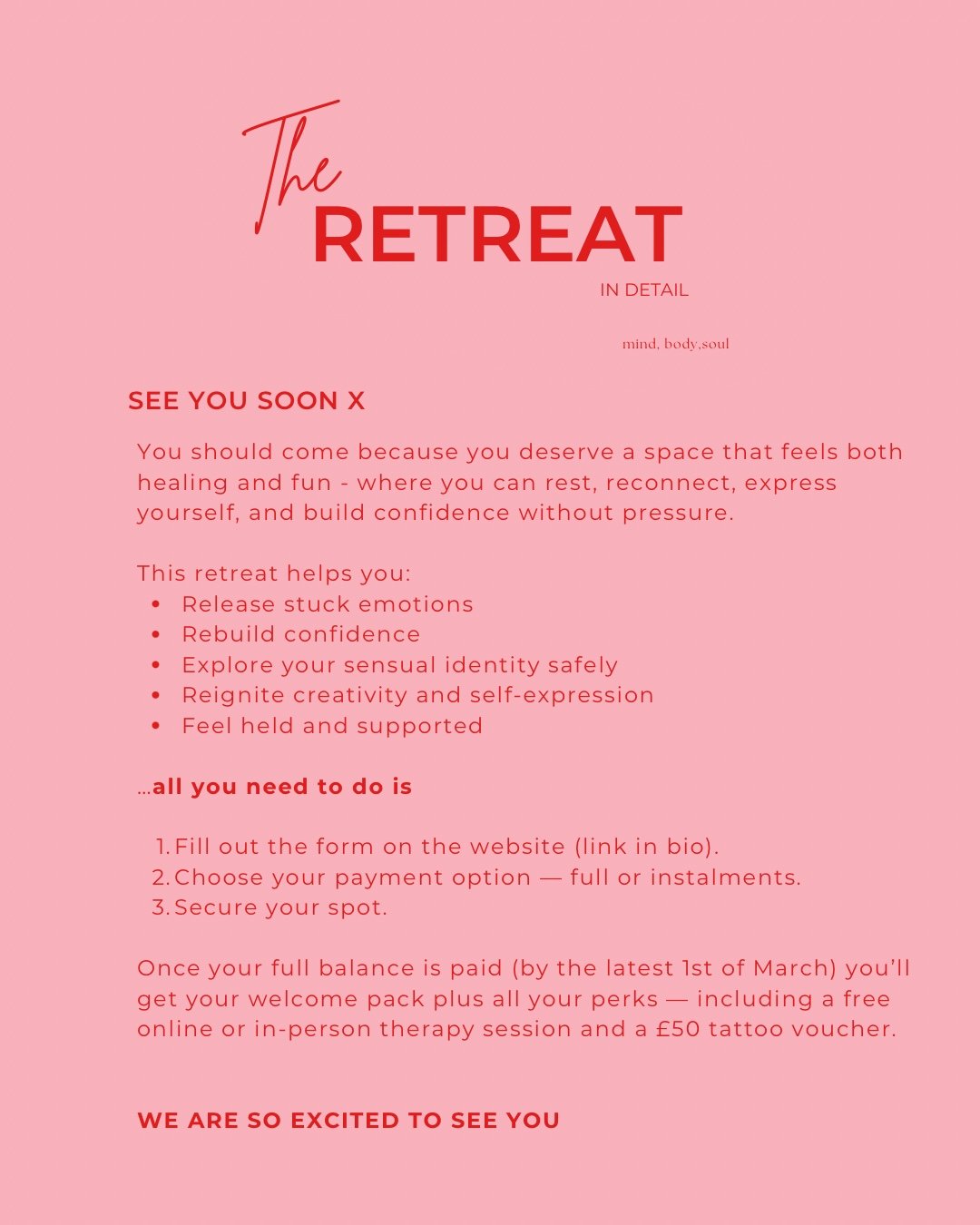 If you're unable to pay the full balance at the time of booking, don't worry — a payment plan can be arranged, with the full balance due by lst March. During the booking process, you can let us know what payment schedule works best for you. A minimum £50 deposit is required to secure your booking. All payments are non-refundable due to the amount of costs involved; however, if you are unable to attend the retreat and your place is filled by someone else, we will provide a full refund of your payments.