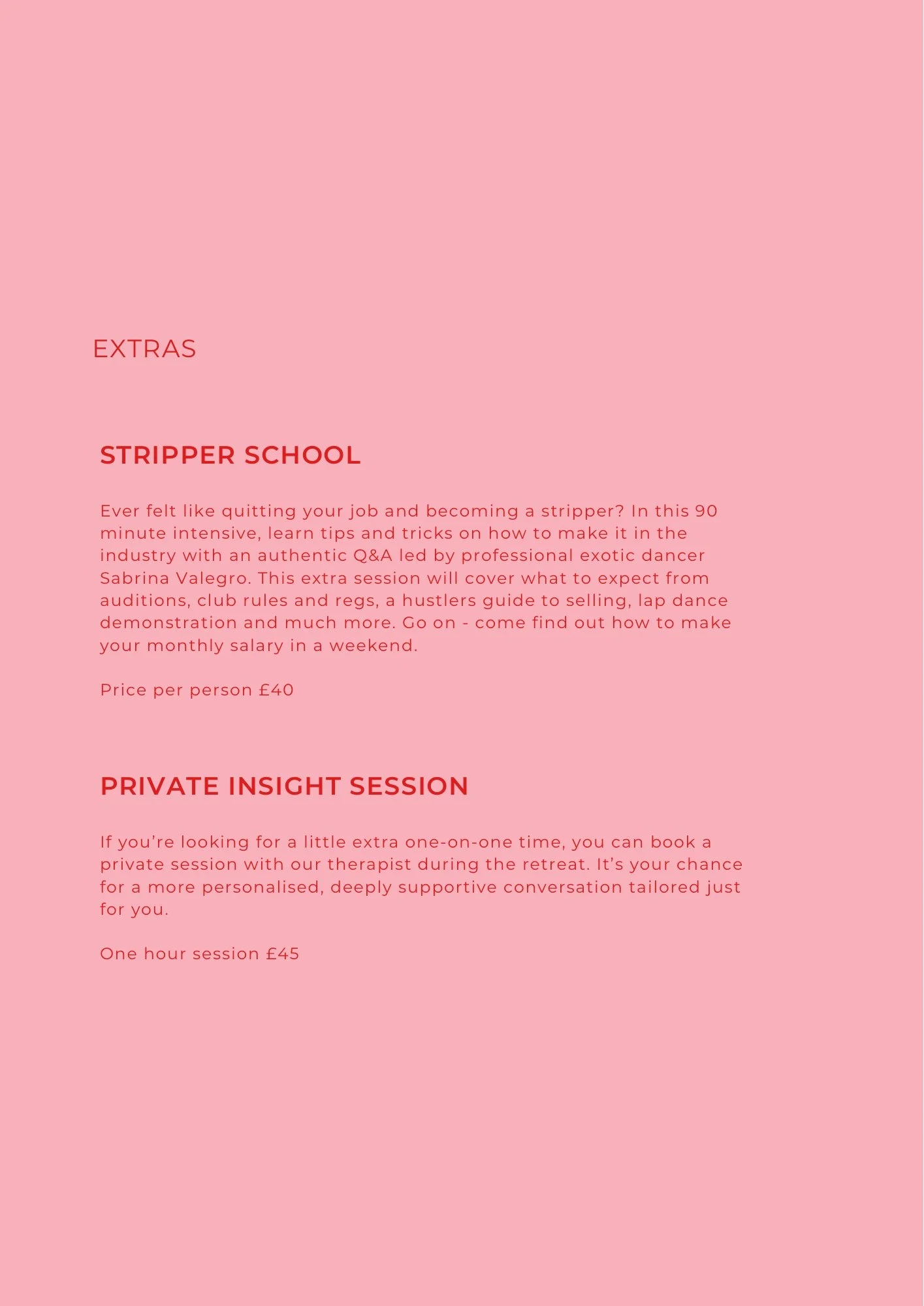 If you’d like to add on the Stripper School or Private Insight Session, just let us know during the booking process. We’ll make sure to accommodate time for it in the schedule so you can plan ahead and enjoy those extra sessions.